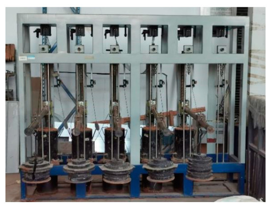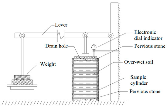Compacting over-wet soil is challenging owing to the high water content and difficulty in draining water. The phenomenon of “springing” may occur during compaction, where the compressed area sinks in, and the surrounding area springs back. Conventional one-way compression tests or triaxial tests have small sample sizes ( = 61.8 mm, = 20 mm, and = 50 mm, = 100 mm) and short drainage paths, which cannot reflect the true conditions of over-wet soils in the stratum. In this study, a large-scale compression test apparatus was used. Figure 4 shows a schematic of the loading device. The sample size is = 200 mm, and = 320 mm, with filter paper and permeable stone placed on the top and bottom of the sample, and with Vaseline applied on the inner wall. The lever loading method was employed, and electronic dial indicators and data collectors (SYNTEK, Hangzhou, China) were used to collect the deformation data continuously. The loading device was fixed to a steel frame, enabling the performance of multiple simultaneous sets of tests. Figure 5 shows the loading process.