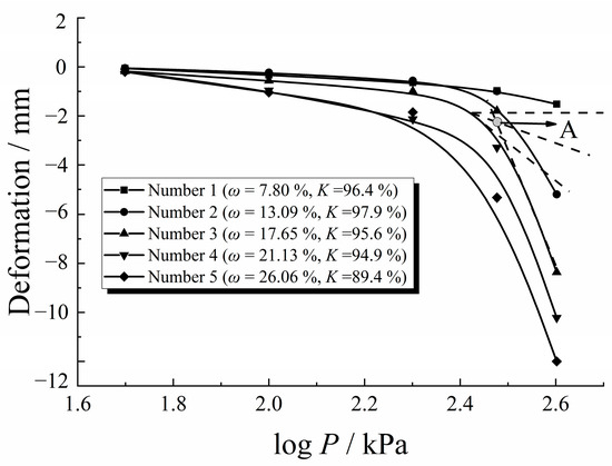 As shown in Figure 12, the deformations of the three samples during the primary consolidation stage differs slightly at 50 kPa. As the load increases, the deformation during the primary consolidation stage gradually increases and stabilizes, slightly decreasing at 400 kPa. The deformation during the secondary consolidation stage gradually increases as the load increases, and the increase rate is proportional to the water content. When the load exceeds the pre-consolidation pressure, the deformation increases rapidly.