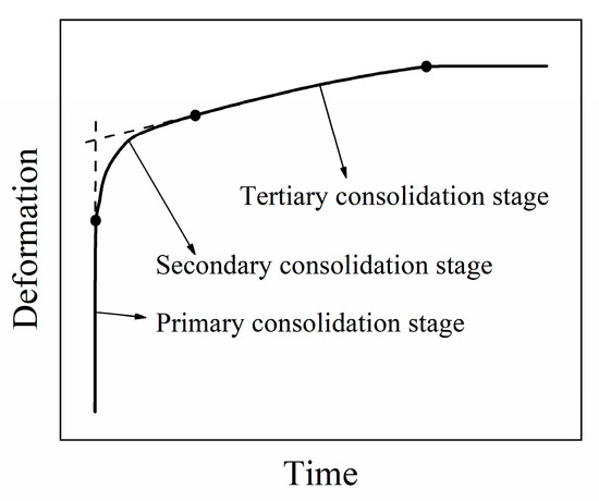 A significant difference between the compression process of over-wet soil and general soft soil exists, as shown in Figure 9, which is similar to that of peat soil with a similarly high water content (Figure 9f). Feng et al. [19] proposed a three-stage compression method based on the long-term creep process of peat soil, as shown in Figure 10, in which the third consolidation stage is a uniformly slow creep stage.