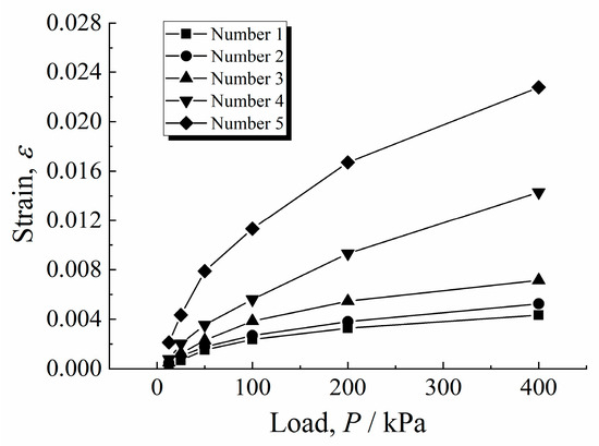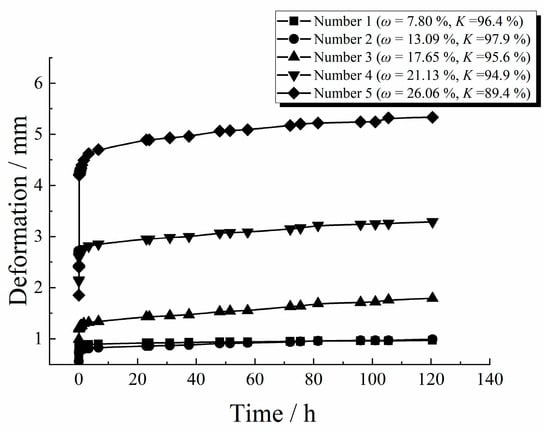 Figure 9 shows the curves of large samples. The deformation curves of samples 1 and 2 conform to the anti-“” deformation law when the load is less than the pre-consolidation pressure. The anti-“” shape of sample 2 disappears when the load exceeds the pre-consolidation pressure. Samples 3, 4, and 5 do not exhibit an inverse “” deformation law at any loads. As the deformation increases, the curves gradually approach a stable secondary consolidation stage because samples 1 and 2 are non-over-wet soils with high compaction. Thus, the long-term deformation is insignificant. However, when the load was low, the deformation of the over-wet soil gradually increased as the compaction degree decreased. When the load exceeded the pre-consolidation pressure, the deformation of the sample was no longer positively correlated with the compaction degree but increased as the water content increased.