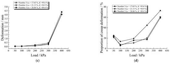 For the creep generated in the tertiary consolidation stage, when the load was below the pre-consolidation pressure, the creep of the over-wet soil was insignificant (<0.5 mm). When the load exceeded the pre-consolidation pressure, the creep variable rapidly increased by >3 mm, and the creep of specimen 5 reached 4.3 mm. As shown in Figure 12 (d), the proportion of creep deformation in the over-wet soil first decreased and then increased as the load increased. When the load was 400 kPa, the creep proportion exceeded 60% and increased as the water content increased.