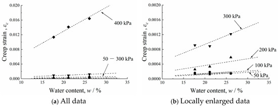 The total creep amount of the wet soil was calculated from 50 to 400 kPa (Table 5). Table 5 indicates a strong correlation between the creep deformation, creep strain, and water content of the over-wet soil.