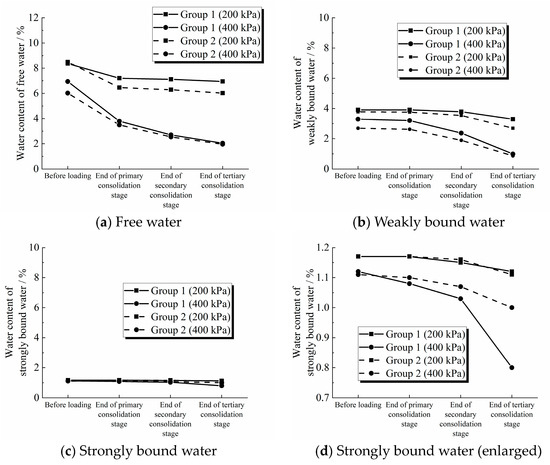 Figure 16a shows that the free and weakly bound water contents continuously decrease during loading. The decrease at 200 kPa is below that at 400 kPa, and the ratios of the two load levels are 1:2.08 (free water) and 1:2.18 (weakly bound water). The content of strongly bound water minimally changes as the load increases.
