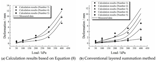 Based on Equation (10), the deformations of the large specimens were calculated according to the compression moduli in Table 8. The height of the sample was 320 mm, which meets the requirement of a soil layer thickness of between 0.3 m and 1 m. Figure 19a compares the calculated and measured results. Figure 19b shows the calculation results obtained using the conventional layered summation method (Equations (7) and (8)).