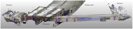 Stations typically feature multiple entrances located on various sides of a street, without the possibility of assigning a single address representing the station in a search engine. The shape of stations is generally linear, consisting primarily of corridors. Some stations feature an intermediate level called a mezzanine floor, situated between the platform and the ground surface. The mezzanine can be simple and located on one side of the station, or it can be extensive, connecting to major transfer stations and incorporating small galleries and service points. Some metro stations have connected platforms with a single access, while others have two separate platforms for trains travelling in opposite directions. Metro stations typically feature numerous points of interest, including turnstiles, platforms, and ticket machines. A 3D view based on the LIDAR point cloud for one of the Warsaw Metro stations is presented in Figure 1.