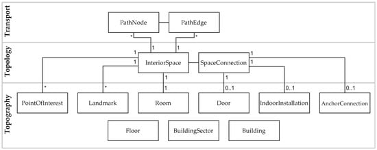 The model of spatial data used in the LIFT project, with clear division into three layers, was based on earlier work of the research team [57,58,59] with modifications specific to metro stations. The classes of the model are presented in Figure 2.