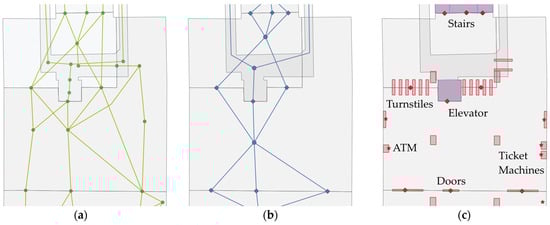 Data layers used in the system: (a) transport network—Path Node as a green circle and Path Edge as a green line; (b) room topology—Interior Space as a blue circle and Space Connection as a blue diamond; (c) building topography—Indoor Installation as a purple rectangle, Furniture as a red rectangle, Point of Interest and Landmark as red stars, and Space Connection as a red diamond.