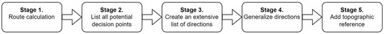 The process of generating navigational directions has been divided into five stages, making the whole process transparent as well as easy to design, analyse, and maintain. Such an approach eases modifications of each stage independently after analysis of the outcomes of the tests following initial implementation; see Figure 4.