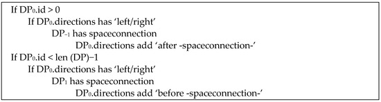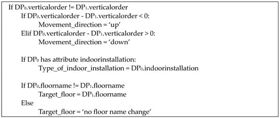 Every change in the level triggers a direction providing detailed information related to this event. The input for this rule is two consecutive nodes with the attributes as follows: id as an ordinal number; vertical order as the order of levels in the building; indoor installation type indicating whether a transition is an escalator, elevator, stairs, or ramp; and floor needed for the name in the real world, displayed to the user. Finally, the outcome contains the movement direction (up or down), the type of Indoor Installation, and the name of the target floor. The pseudocode for this rule is provided in Figure 6.