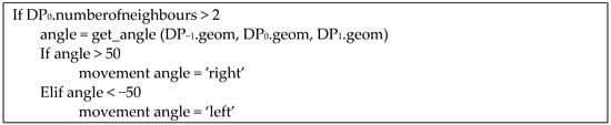 Rule 3-4 determines the angle between two consecutive Path Edges based on the geometry. For calculations, three consecutive nodes are used with the id as an ordinal number, point geometry, and number of neighbours expressed in an integer. The output is an angle and, consequently, the left/right direction. The pseudocode for this rule is provided in Figure 7.