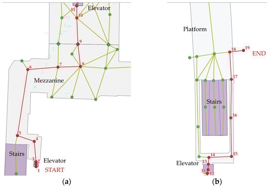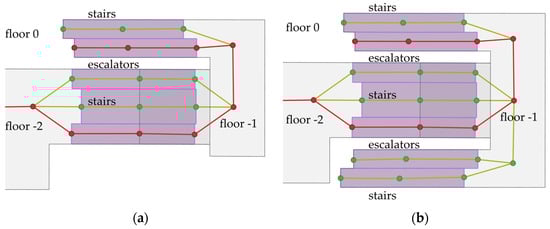 Figure 13. Examples of floor connections: (a) staircase with separated escalators, (b) staircase with subsequent escalators; the maps present Interior Spaces (grey), Indoor Installations (purple), Path Edges (green and red for parts of the route), and Path Nodes (circles); decision points are marked in red. - A different situation is presented in Figure 13b. The possible connections between the ground floor and floor −2 fork to opposite sides of the stairs. When the user goes down, there is no alternative path, so directions should be generalised. However, in the case of going up, it is important to take the correct exit from the station. Hence, the information on whether to take a left or right turn is essential;