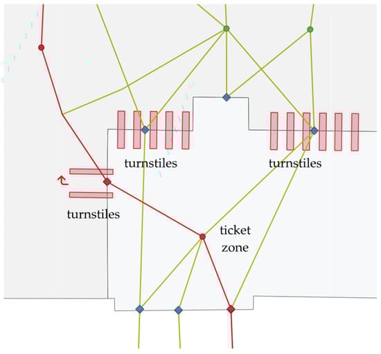 Attributes of Space Connections model the rules of traffic flow. Some connections have a limited time of crossing—doors and turnstiles are related to the metro operating times. Others preclude some groups of people with special needs—small steps or turnstiles are a real barrier for people in wheelchairs. Based on the type, if necessary, some costs can be added to avoid situations when the route with the shortest distance crosses the ticket zone.