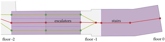 - Subsequent stairs: Although some stairs are connected to a single navigational direction, in some cases, the algorithm should consider the consecutive stairs to be separate objects, which is an expected outcome when they are of different types (stairs, escalators, moving walkways) or if the distance between them is big enough. An example of such a situation is shown in Figure 14. The tests led to the decision to implement the rules to generalise the directions if the distance is less than 12 m, regardless of whether they are of the same type or not.