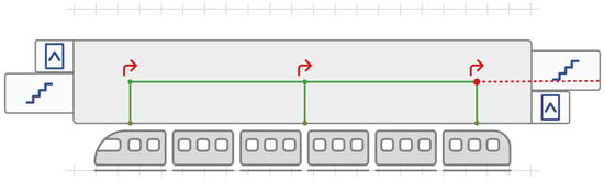 The second problem related to the start of the route on the platform is the choice of the appropriate stairs. If there are several stairs on the platform leading to different parts of the station, then the situation is simplified, as it is optimal to choose particular stairs in order to exit the station at the right point on the ground level. However, there are stations where the choice of stairs on the platform is irrelevant, and passengers in this situation choose the stairs closest to them and would expect the algorithm to work the same. Since it is not known from which part of the train the user has disembarked, without a precise positioning system it is not possible to solve this problem perfectly. The system, however, estimates the user’s position at the station considering the navigation guidance at the station where the metro journey commenced.