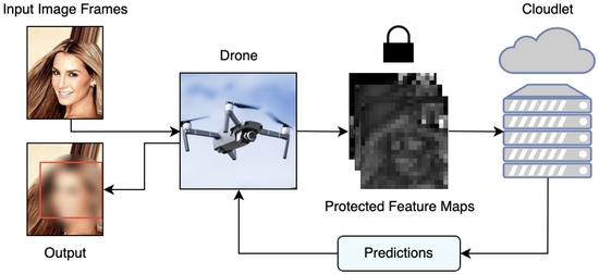 Ref. [6] discussed an end-to-end cloud-based security framework called “DroneNet-Sec”. The authors considered drones used for video analytics where a cloud and edge infrastructure supports the drones. However, their trust model includes the cloud infrastructure and the threats include man-in-the-middle attacks, denial of service, replay attacks, etc. We assume the cloudlet to be a semi-honest entity and, thus, adopt a fundamentally different approach to privacy protection by focusing on the information transmitted through the computer vision pipeline.