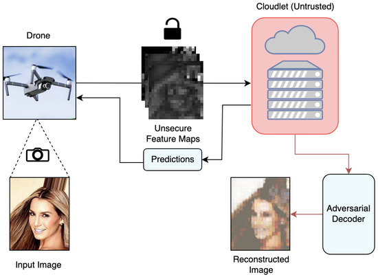 Distributed deep learning systems leverage compute offloading due to the ubiquitous connectivity supported by modern wireless systems. From the perspective of the drone, the cloudlet has much richer computational resources. In the split-model architecture, the feature maps or IR are sent to the cloudlet for further processing. While the feature maps do not contain PII, it is necessary to consider the possibility of recovering PII from the feature maps through an adversarial attack. Recovering (or partially recovering) PII from the IR is an inverse problem and an image reconstruction attack is possible using, for example, an autoencoder or GAN, despite the challenges that modern DNNs pose.