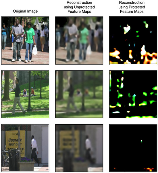 In Figure 8, we consider the worst-case scenario in which the reconstruction from unprotected feature maps results in images that bear a significant resemblance to the original images. In the third column, we see that our proposed scheme can minimize the exposure of any information in the images to the cloudlet.