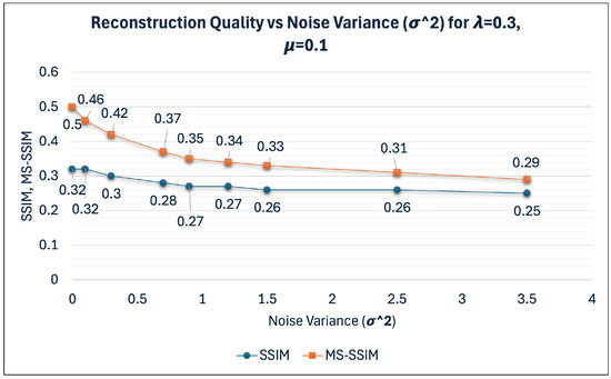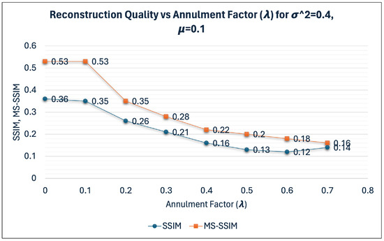 The quantitative results are presented for the CelebA dataset and the model configurations are evaluated based on two classic metrics that are known for measuring image similarity: the Structural Similarity Index (SSIM) [19] and Multiscale Structural Similarity Index (MS-SSIM) [20]. In Figure 6 and Figure 7, the impacts of the annulment factor () and noise variance () on SSIM and MS-SSIM are shown.
