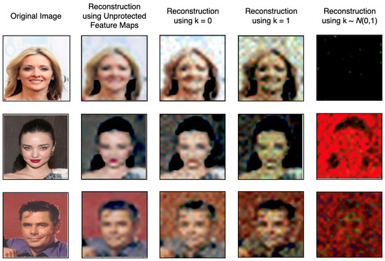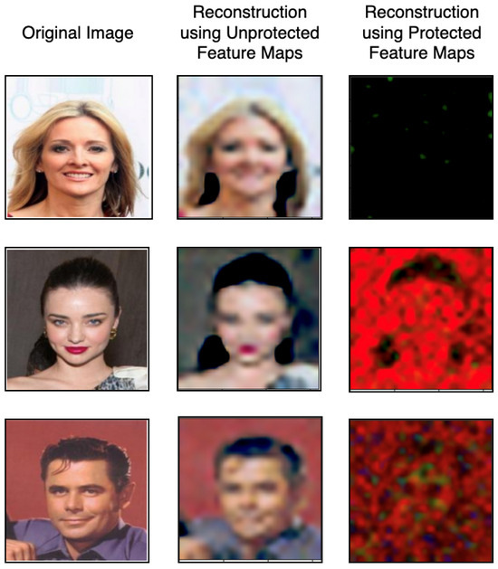 Comparison of reconstruction quality with and without our proposed scheme. The first column shows original images taken from the CelebA dataset, the second column shows the images reconstructed using the unprotected feature maps without using our scheme, and the third column shows the images reconstructed using an annulment factor of , noise variance of , and mean of . The annulment value used is based on a Gaussian distribution (i.e., ).