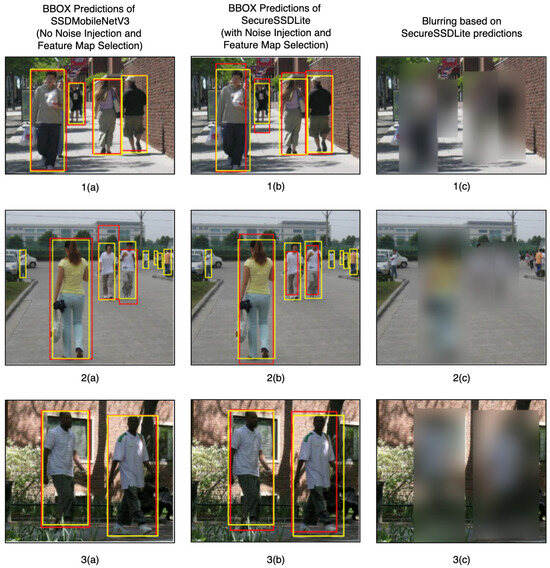 Comparison between SSD-MobileNetV3 (first column) and Secure SSDLite (ours, second column) bounding box predictions for samples from the PennFudan dataset. The yellow bounding boxes are the ground truth and the red boxes are the predicted boxes. The third column blurs the sensitive regions based on the predictions from the Secure SSDLite model with . Subfigures 1(a)–3(c) are examples of predicted bounding boxes with varying subjects and sizes.