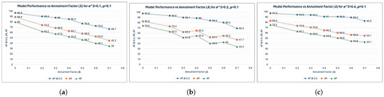 Performance of Secure SSDLite (AP@0.5, AP, AR) vs. annulment factor for different variance thresholds. Here, the variance threshold refers to the variance, , of the Gaussian distribution from which the additive noise is sampled. Similarly, the mean, , is the mean of the aforementioned Gaussian distribution. (a) Performance of Secure SSDLite (AP@0.5, AP, AR) vs. annulment factor for variance threshold . (b) Performance of Secure SSDLite (AP@0.5, AP, AR) vs. annulment factor for variance threshold . (c) Performance of Secure SSDLite (AP@0.5, AP, AR) vs. annulment factor for variance threshold .