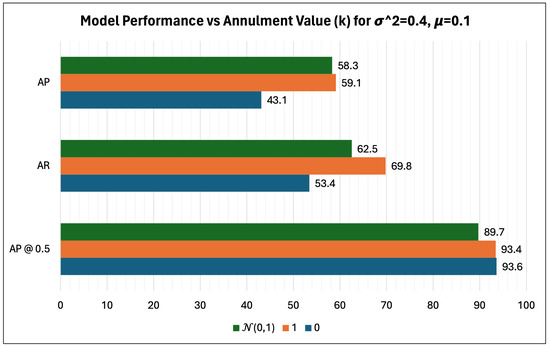 Performance of Secure SSDLite (AP, AR, AP@0.5) vs. annulment value (k) for variance threshold .