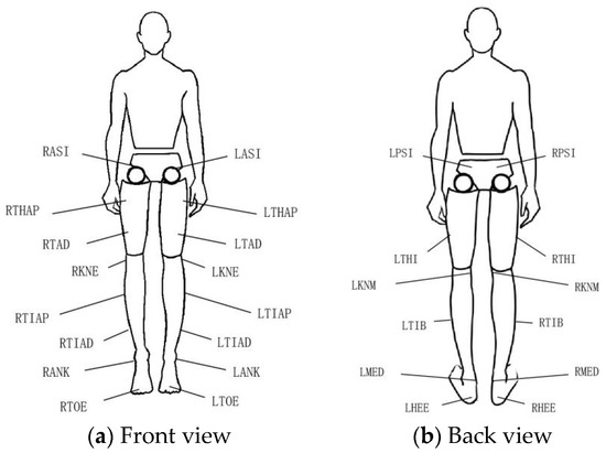 Participants were dressed in uniform experimental footwear, socks, and clothing provided by the laboratory. After completing a warm-up, 28 marker points with a diameter of 14 mm were affixed to their bodies (Figure 1) following the CGM23 lower-limb model, with marker placements at the bilateral anterior superior iliac spines, bilateral posterior superior iliac spines, lateral and medial condyles of the knee, lateral and medial malleoli, calcanei, and the bases of the second metatarsals. Furthermore, markers were positioned at the upper and lower thirds of the left thigh and lower leg, as well as the upper and lower thirds of the right thigh and lower leg, ensuring a detailed and anatomically accurate representation of the lower limb for motion analysis. Subsequently, they familiarized themselves with the single-leg drop landing movements. To minimize experimental error, the application of all marker points was performed by a single individual.