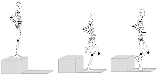 The single-leg drop landing movement test was designed based on previous research by Meng et al. [2], where participants stood naturally on a 30 cm high jump box with their feet shoulder-width apart. During the test, participants placed their hands on their waist to avoid the inertia generated by arm swinging. Under four different footwear conditions (barefoot, sock-wearing, shoe-wearing, and sock-and-shoe-wearing), participants were required to perform single-leg drop landing tasks, all adopting a “toe-heel” landing pattern (Figure 2) [23]. In each test condition, participants had to complete three successful single-leg drop landings. The results of the three trials for each participant were averaged to reduce random errors and enhance the reliability of the data.