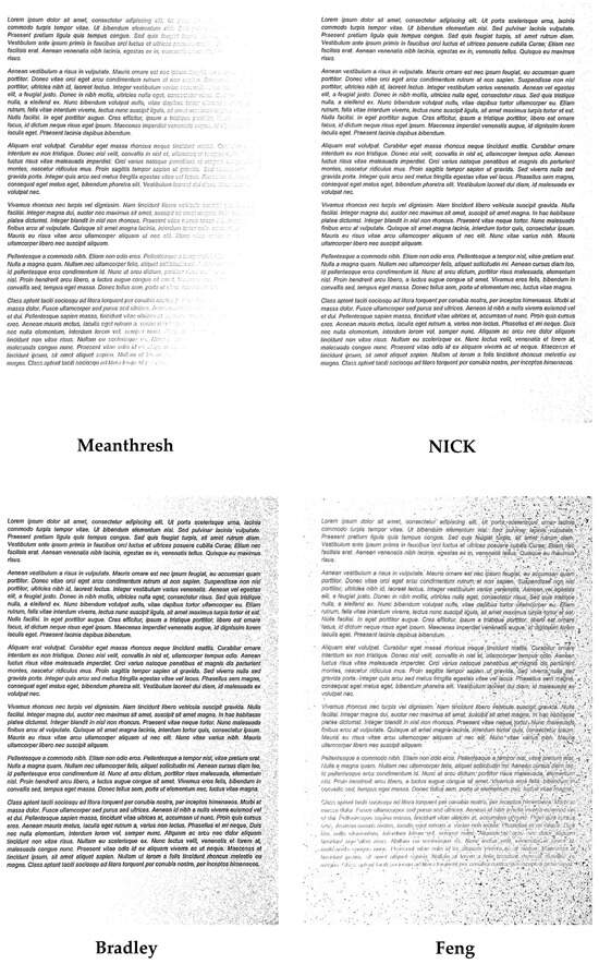 Since the WEZUT OCR Dataset contains photos of the documents printed using five different popular font shapes (Arial, Times New Roman, Calibri, Courier, and Verdana) with some typical modifications of attributes (normal, bold and italic versions of all fonts, as well as bold italics), each of the 1760 images obtained after thresholding has been compared with their equivalents obtained from the same source image using the other binarization methods. Finally, the nine similarity values have been averaged, leading to an aggregated mutual quality index. Then, the Pearson’s linear correlation coefficient values between them and the Levenshtein Distances computed for the same image have been determined to verify the appropriateness and usefulness of each image quality/similarity metric for the prediction of the quality of OCR results. Obviously, as it may be noticed in Figure 1, Figure 2, Figure 3 and Figure 4, some binarization methods have caused the loss of data and some characters are impossible to recognize.