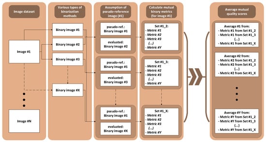 Since no-reference quality metrics for binary images are not known and the binary image quality assessment is based on the comparison with ground-truth images, it is proposed to determine the mutual similarities assuming that one of the binary images is considered a pseudo-reference image. The average mutual similarity values obtained as the results of such comparisons with images obtained the other binarization methods are saved as the final metrics separately for each of the considered elementary metrics. The illustration of this idea is presented in the form of a simplified flowchart in Figure 5.