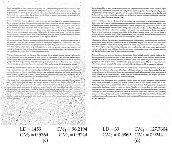 During the experiments, some classical metrics based on the confusion matrix, typically used for the evaluation of binarization methods, as well as for performance metrics for pattern recognition or classification purposes, have been used, mainly due to their fast computation. The most widely known such metrics include Precision (defined as the ratio of true positives to all predicted positives) and Recall/Sensitivity (ratio of true positives to all actual positives), where black pixels representing the foreground information are considered positives and white background pixels negatives. The other metrics, based on similar computations, are F-Measure (harmonic mean of Precision and Recall), Accuracy (ratio of the sum of all true positives and true negatives to all pixels), pseudo-Precision, pseudo-Recall, pseudo-F-Measure, and Specificity [], as well as the less popular Peak Signal-to-Noise Ratio (PSNR), Balanced Classification Rate (BCR), S-F-Measure, and Geometric Accuracy.