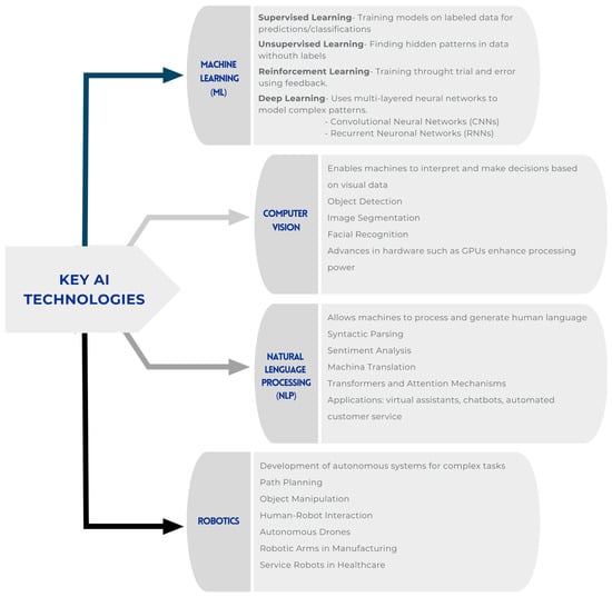 Machine Learning (ML): ML algorithms are designed to learn from and make predictions based on data. Techniques such as supervised learning, unsupervised learning, and reinforcement learning fall under this category. In supervised learning, models are trained on labeled data, enabling them to make predictions or classifications. Unsupervised learning involves finding hidden patterns or intrinsic structures in input data without labeled responses. Reinforcement learning trains algorithms through trial and error, using feedback from their actions to learn optimal behaviors [