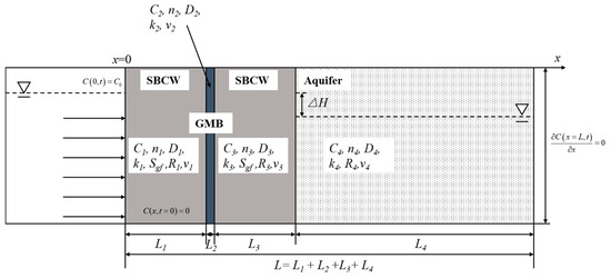 A CGCW consisting of an upstream SBCW, an HDPE GMB and a downstream SBCW is installed to prevent the aquifer from being polluted by contaminants, as shown in Figure 1. A one-dimensional model considering the effect of advection, hydrodynamic dispersion and adsorption is established to evaluate the performance of the CGCW. The thicknesses of the upstream SBCW, HDPE GMB, downstream SBCW and aquifer are denoted as L1, L2, L3 and L4, respectively. The following assumptions are made to develop the mathematical model: