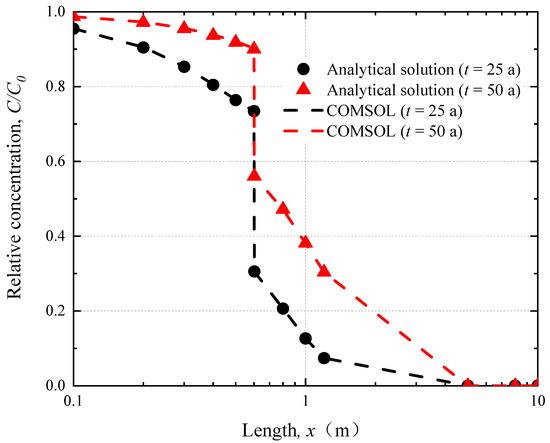 The 1D numerical model is established to verify the proposed analytical solution in this section. Darcy’s Law and Transport of Diluted Species in Porous Media modulus are used to simulate the contaminant transport through CGCW and aquifer system. The thicknesses of the SBCW, GMB, and aquifer are assumed to be 0.6 m, 0.0015 m and 10 m [12,20]. The extra fine physics-controlled meshing sequences are invoked and 166 computational units are generated. Methyl tertiary butyl ether (MTBE) is considered as the contaminant in the source [33]. The parameters used in the calculation are all listed in Table 1. It should be noted that the leakage through the GMB is calculated to be 2.7 × 10−10 m/s in this section. It can be concluded from Figure 2 that the results obtained from the analytical solution are in agreement with those from the numerical simulations. The differences between the results predicted by the proposed analytical solution and the numerical model for t = 25 and 50 years are only 0.1% and 0.12%, respectively. This indicates that the analytical solution can accurately predict contaminants transport through the CGCW and aquifer system. Additionally, the CGCW can effectively block the water flow and decrease the contaminant concentration in the groundwater. For example, the contaminant concentrations at x = 0.6 and 0.6015 are 0.73 and 0.31 when t = 25 years, respectively. The main reason for this phenomenon is that the diffusion coefficients (7.7 × 10−13 m2/s) and partition coefficients (0.6) in GMB for MTBE are small. GMB can effectively impede the transport of MTBE. This will lead to a huge contaminant concentration mutation between two sides of GMB [30].