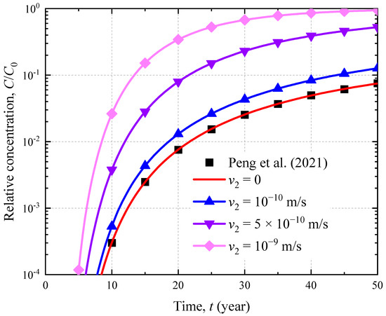 A pure diffusion analytical model proposed by Peng et al. [30] is selected to verify the proposed solution. The values of parameters used for comparison are the same as those in Section 3.1. The breakthrough curves of the CGCW under different leakages are shown in Figure 3. It can be concluded that the difference between the results predicted by the pure diffusion model and the proposed model is only 1.01% when there is no leakage (v2 = 0). This demonstrates the accuracy of the proposed solution. Additionally, it can be found that the leakage can pose significantly effects on the CGCW performance. For example, the contaminant concentrations for v2 = 10−9 m/s can be 7.43 and 1.79 times larger than that for v2 = 10−10 m/s and v2 = 5 × 10−10 m/s when t = 50 years, respectively. It indicates that the effects of leakage caused by the GMB holes should be taken into consideration. Additionally, the proposed solution can offer more accurate suggestions for the design of the CGCW.