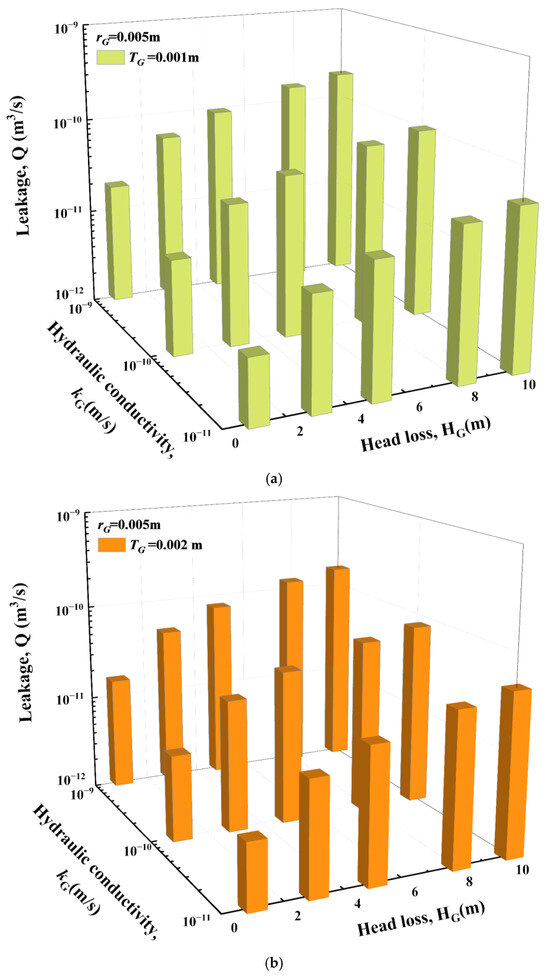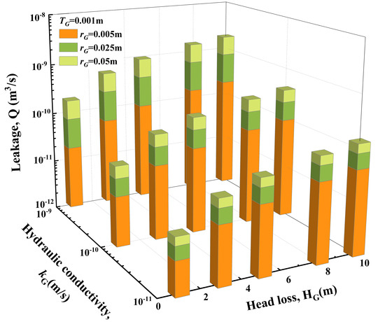 Increasing the GMB thickness and decreasing the head loss and cut-off wall hydraulic conductivity can decrease the leakage (Figure 4). For example, the leakage for TG = 0.002 m is 1.52 × 10−10 m3/s while it for TG = 0.001 m is 1.85 × 10−10 m3/s when kG = 1 × 10−9 m/s, rG = 0.005 m, and HG = 10 m. The values of the leakage and head loss are linearly related. For example, increasing the HG from 1 m to 10 m leads to a 10-time increase in the leakage. Experiments conducted by Rowe and Fan [25] have also proved this conclusion. Additionally, it can be concluded that changing the TG has an insignificant influence on the leakage when the kG is small. For example, the leakage for TG = 0.002 m is 1.22 times smaller than that for TG = 0.001 m when kG = 1 × 10−9 m/s, rG = 0.005 m. However, the difference decreases to 1.02 times when kG = 1 × 10−11 m/s. This is mainly because the SBCWs are the dominant parts to prevent leakage, though increasing the GMB thickness can lead to a decrease in the hydraulic gradient [25].