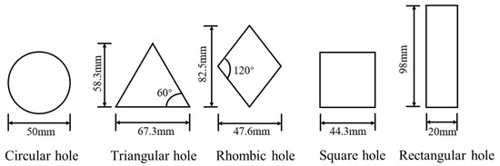 The effects of different hole shapes such as circular, triangular, rhombic, square, and rectangular on the leakage are investigated. The dimensional drawing of the designed GMB holes are shown in Figure 6. To avoid the influence of the different hole areas on the leakage, hole areas of all shapes are assumed to be 1960 mm2. The cut-off wall hydraulic coefficient, head loss and GMB thickness are assumed to be 1 × 10−9 m/s, 1 m and 0.0015 m, respectively [31]. It can be calculated that the leakage in the circular hole is 5.3 × 10−11 m3/s while leakages for other hole shapes are in the range of 1.28 × 10−10 m3/s–1.32 × 10−10 m3/s. This is mainly because the shape factor for the circular hole is 1.15–1.3 times lower than that for other shapes of holes with the same area [25]. It leads to the appearance of a lower leakage in the circular hole. Similar conclusions have also reported by Xia et al. [37]. They found that compared with other hole shapes, the stress distribution around the circular hole is more uniform. This can help minimize tearing or failure of the GMB caused by the stress concentration at any single point.