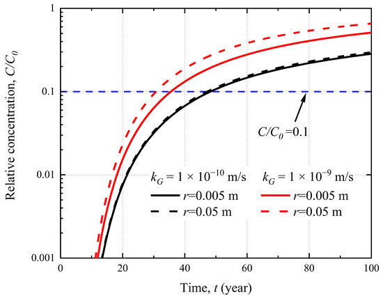 The influence of the hole radius (rG) on the breakthrough curve of the CGCW is shown in Figure 7. The HG is assumed to be 3.0 m. It can be concluded that increasing rG can lead to a decrease in the breakthrough time. However, this effect can be insignificant when kG is small (e.g., <10−10 m/s). For example, the breakthrough times for rG = 0.005 m and 0.05 m are 47.3 and 48.1 years when kG = 10−10 m/s, respectively. Additionally, the breakthrough time for rG = 0.005 m is 5 years longer than that for rG = 0.05 m when kG = 10−9 m/s. The main reason is that the impermeability of the CGCW is good when kG is small (as mentioned in Section 3.2). This will weaken the impacts of the hole geometric properties on the leakage. Moreover, it can also be observed from the empirical equations in Table 2 that leakage is directly proportional to both kG and rG0.192, respectively. The influence of kG is more significant than that of rG. In other words, reducing kG can minimize the negative influence of GMB holes on the service time of the CGCWs. Therefore, it is essential to use the cut-off wall materials with lower hydraulic conductivities in the actual projects.