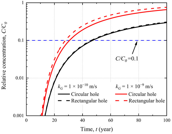 The influence of the hole shape on the breakthrough curve of the CGCW is shown in Figure 8. Two different hole shapes including circular and rectangular holes are analyzed. The HG, rG and TG are assumed to be 3 m, 0.05 m and 0.0015 m, respectively. Compared with other hole shapes, the performance of the CGCW is better when the GMB holes are circular. For example, the breakthrough time for a circular hole is 1.1 times larger than that for a rectangular hole when kG = 10−9 m/s. It is mainly because the leakage through a circular hole is lower than that through other shapes of holes as the shape factor for the circular hole is lowest. Additionally, it can be found that the influence of the hole radius and shape are similar. The same trend that the parameter impacts will be weakened when the impermeability of the CGCW is good. For example, the breakthrough time for the circular hole is only 0.9 years longer than that for the rectangular hole when kG = 10−10 m/s.