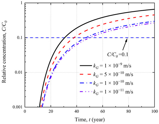 The influence of the cut-off wall hydraulic coefficient (kG) on the breakthrough curve of the CGCW is shown in Figure 9. The HG, rG and TG are assumed to be 3.0 m, 0.05 m and 0.0015 m, respectively. Increasing the kG can result in a worse performance of the CGCW. For example, the breakthrough time for kG = 10−10 m/s is 1.3 and 1.5 times larger than that for kG = 5 × 10−10 m/s and 1 × 10−9 m/s, respectively. This is mainly because decreasing kG can significantly decrease the leakage. This has also been mentioned in Section 4.1. Additionally, it can be concluded that kG has little effect on the CGCW performance when it is small (e.g., <10−10 m/s). The breakthrough curves of kG = 10−10 m/s and 10−11 m/s are almost coincident. The breakthrough time for kG = 10−11 m/s is only 1.06 times larger than that for kG = 10−10 m/s. The dispersion can be the dominant mechanism for contaminant transport as the Peclet number in the cut-off wall is lower than 1 (e.g., <0.26) when kG < 10−10 m/s. Thus, there is a threshold for kG in the CGCW (e.g., 10−10 m/s) that can not only satisfy economic and safety needs. In other words, decreasing kG cannot help much to the CGCW performance when it is lower than the threshold. It can be very important to find the threshold in the design of the CGCW.