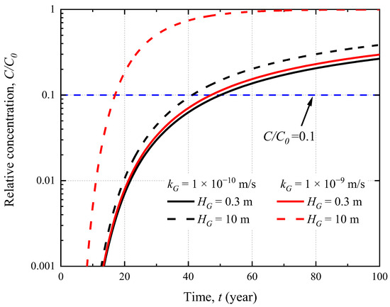 The influence of the head loss (HG) on the breakthrough curve of the CGCW is shown in Figure 10. The rG, TG and are assumed to be 0.05 m and 0.0015 m, respectively. Increasing HG can lead to a decrease in the breakthrough time. For example, the breakthrough time for HG = 0.3 m is 30 years longer than that for HG = 10 m when kG = 10−9 m/s. The main reason is that the contaminant transport in the CGCW can be accelerated with the increase of HG. More contaminants can break through the barrier and migrate to the groundwater. Thus, the methods that can control the head loss (e.g., a pumping well) should be taken to improve the performance of the CGCW. Additionally, it can be concluded that the effect of HG can be weakened when the impermeability of the barrier wall is relatively good (e.g., kG = 10−10 m/s). For example, although HG increases by 33-fold (from 0.3 m to 10 m), the breakthrough time of the CGCW is only 1.2 times larger than before when kG = 10−10 m/s. It can also be demonstrated from the empirical equation for circular holes in Table 2 that even if the head loss is large (e.g., 10 m), the leakage is lower than 1.2 × 10−10 m3/s when kG = 10−10 m/s.