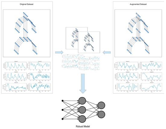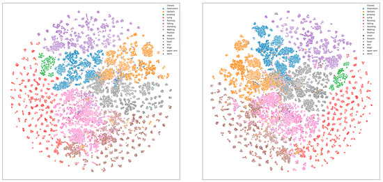 The mixup augmentation technique blends the time-series data from two separate activities, creating synthetic samples that enhance the training dataset’s diversity. The representation of each class after dimensionality reduction with t-SNE [59], similar to [22], can be seen in Figure 3. We can see in the figure that mixup provides additional data points to improve model generalization and provide additional data points for classes with a lower number of samples.