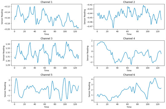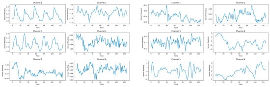 The graphs in Figure 1 and Figure 2 display sensor readings from a human activity sample before (Figure 1) and after (Figure 2) applying the mixup technique. The data are presented across six separate channels, each representing different sensor readings over time. The x-axis of each plot denotes time, while the y-axis indicates the sensor reading values. For each channel, the signal exhibits a combination of patterns derived from two different samples, reflecting the linear interpolation characteristic of mixup.