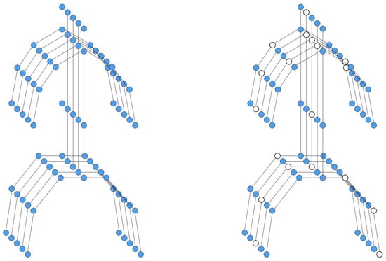 This cutout augmentation technique effectively masks or “removes” selected joints from the skeleton data, simulating missing or occluded parts of the body, as shown in Figure 5. By doing so, the model is trained to recognize activities using only the remaining visible joints, encouraging it to focus on broader movement patterns rather than relying on specific joints. This enhances the model’s robustness, improving its ability to generalize to real-world scenarios where sensor data might be incomplete or noisy.