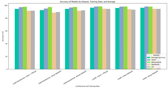 Our experimental results were obtained on an NVIDIA Ampere A100 GPU with 80 gigabytes of video RAM, manufactured by NVIDIA Corporation, based in Santa Clara, CA, USA. When it comes to vision mixup methods for sensor-based data, we tested our method on four datasets, namely HHAR [61], MotionSense [62], UCI-HAR [63], and the RealWorld dataset [64]. In our experiments, we show that models trained on mixup augmented datasets produce better results than the baseline transformer-based models [22,60], as shown in Table 1 and, more succinctly, in Figure 6.