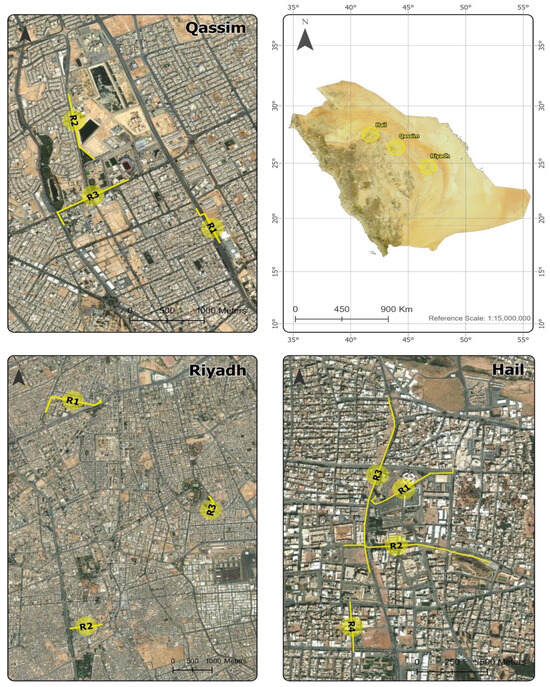The study sites were selected in three regions of the KSA: Riyadh, Qassim, and Hail. Each city’s urban area accommodates multiple routes and has different urban challenges. Riyadh is the capital and thus faces fast urban growth with complicated issues in terms of infrastructure and accessibility for PWD. Qassim is a big agricultural hub, which means that more services and facilities are in demand against the scale of the growing population. With its diversified topography and tourist appeal, Hail city makes enhancing smooth mobility for PWD a challenge. Such places could present wide variations in urban accessibility challenges while providing generalizable results to similar locations. This study carefully selected specific routes within each city to reflect a variety of urban environments and challenges faced by PWD. First, Riyadh, the capital of the KSA, is situated centrally, as seen in Figure 1. It is a rapidly expanding city, presenting numerous societal, economic, and ecological issues. The population growth rate of Riyadh in the year 1438 AH was 4%, significantly above the global average of 2.5%. This rapid population growth presents issues regarding adequate housing, services, facilities, and job opportunities to prevent potential urban crises [51]. This study identified three routes, which were selected in high-traffic areas that connect major medical centers, tourist sites, and transport hubs, highlighting the need for accessible infrastructure in essential and frequently used locations, with selected footpaths measuring 1850 m, 816 m, and 492 m in length.