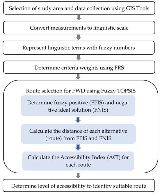 The term “accessibility” is commonly employed by geographers, economists, and planners. The ease of reaching a destination, based on multi-criteria, is frequently utilized to define accessibility in mobility [28]. This definition is the foundation for several statistical methods used to evaluate accessibility for pedestrian networks. Past studies have evaluated accessibility by quantifying the cost value associated with footpaths. Accessibility analysis involves the process of defining and computing accessibility measurements, as well as presenting and analyzing outcomes by considering the target group, the destinations to be reached, and the means of travel. Typically quantified in terms of cost, time, or distance, these factors can help establish an accessibility index [29]. The various factors influencing accessibility make it related to multi-criteria decision analysis (MCDA) [30]. Determining the relative weights of criteria and evaluating their significance are critical challenges in applying multi-criteria decision analysis. Given that human judgments, including preferences, are frequently imprecise and cannot be precisely quantified, using fuzzy principles in determining weights is considered significant.