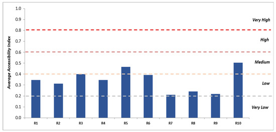 Fuzzy Technique for Order of Preference by Similarity to Ideal Solution (Fuzzy TOPSIS) was used to calculate the ACI for the selected routes. The ACI values range between 0 and 1, with 0 indicating no accessibility and 1 indicating the highest level of accessibility. Fuzzy TOPSIS is a multi-criteria decision analysis method, initially developed by Hwang and Yoon in 1981, with further developments by Yoon in 1987 and Hwang, Lai, and Liu in 1993. The method objectively and systematically evaluates alternatives on multiple criteria, relying on determining the closest distance to the fuzzy positive ideal solution (FPIS) and the furthest distance to the fuzzy negative ideal solution (FNIS) [57]. Under many conditions, crisp data are inadequate to model real-life situations, while human judgments, including preferences, are often vague and cannot be estimated with an exact numerical value. In this study the linguistic scale was used to assess the ratings and weights of the criteria. The selection of the accessibility criteria was based on several important factors directly related to the study objectives. Participants also quickly understood them and contributed to the decision-making process. The following are the steps of Fuzzy TOPSIS: