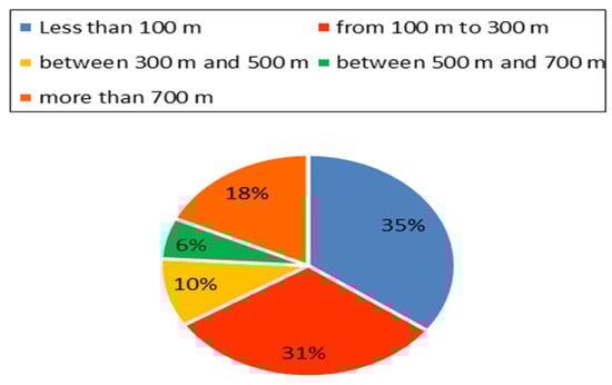 Other criteria, such as length, the most critical criterion for manual wheelchair users, were extended for all routes except for R10, which was 398 m with a high rating, and R3, which was 568 m with a medium rating. According to the survey, the remaining routes received low to ‘very low’ ratings. Figure 5 illustrates that the majority (35%) of respondents cannot move more than 100 m, and 31% cannot travel distances greater than 300 m. The percentages were lower for longer distances. Absent, or recently started, public transport in most of Hail and Qassim cities can reduce the fixed distance between an origin and a destination, reducing the distance PWD must travel. As for the absence percentage of footpaths, route R7 was higher than half (61.53%) of their total length, whereas no footpath was available, and other routes had lower percentages. The goal is to provide dedicated paths, especially in urban areas, to ensure safety and ease of access.