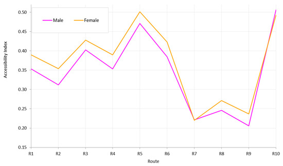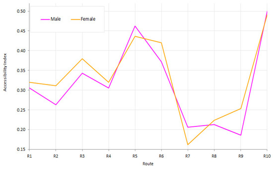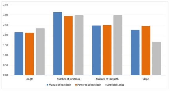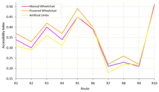 Except in a few cities, public transport projects can reduce the travel time and distance for PWD in the towns and cities of Hail and Qassim. The number of junctions and the absence of footpaths were also identified as essential criteria by the participants for most routes studied. This study also explored the impact of the type of mobility aid (powered wheelchair, manual wheelchair, and artificial limb) the users have on their preferences. Length was the most crucial criterion for manual wheelchair users, the absence of a footpath was the most important for powered wheelchair users, and slope was critical for users of artificial limbs. Although the comparison of accessibility for each disabled person’s vehicle found no significant difference from the overall average obtained from all participants, powered wheelchair users had a slight advantage due to the higher evaluation for the absence of a footpath, which emerged as their most critical criterion.